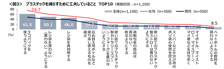 続いて「レジ袋を買わない(貰わない)ようにする」「レジ袋を再利用する」と、レジ袋に関する項目が上位に来る。男女別でみると、女性の方が全ての項目で高く、「エコバックを使うようにする」は74.7%と最も高い。