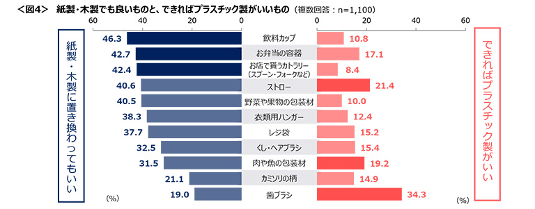 一方で、できればプラスチック製がいいとするものは「歯ブラシ」「ストロー」「肉や魚の包装材」の順で高い。プラスチック製がいいという回答が、紙製・木製でもいいを上回っているのは「歯ブラシ」のみとなった。