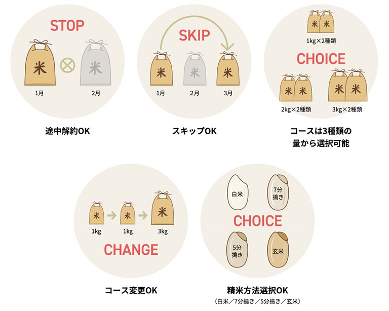 同サービスでは、①1kg×2種類=2kgセット(送料込2,640円)、②2kg×2種類=4kg(送料込4,420円)、③3kg×2種類=6kg(送料込5,980円)の3つのコースをご用意。また、コース変更やスキップが自由に行えることに加え、白米、7分搗き、5分搗き、玄米の中から精米方法の選択も可能となっており、利用者のライフスタイル合わせてご利用いただくことができます。