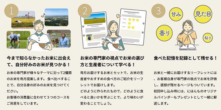 「朝ごはんにぴったりなお米」、「炊き込みご飯にぴったりなお米」、「中華にぴったりなお米」など、毎回、様々なテーマに沿って2種類のお米を食べ比べできるセットが届き、それぞれを食べ比べていただくことで自分自身のお好みのお米を見つけていただくことができます。また、お届けするお米とセットでお米の生産者情報はもちろん、生産の背景や食べ方の提案など、お米の選び方や生産者についても学ぶことができます。