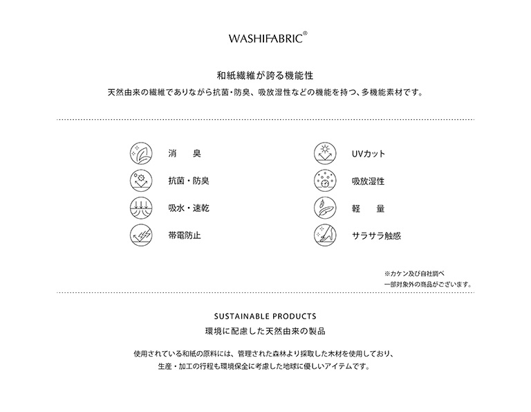 「和紙がつくる健やかな肌。」をコンセプトとして2019年8月にデビュー。肌に触れるほぼ全てが和紙の素材“WASHIFABRIC® ”を使用したアンダーウェアやルームウェアを中心に、レディース・メンズ・ベビーアイテムを展開。その他、和紙を使用したデニムなど普遍的な日常着からオリジナルの洗剤や器など生活雑貨も取り扱い、ライフスタイルを支えるブランドとして数々の商品を提案。