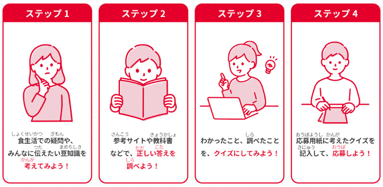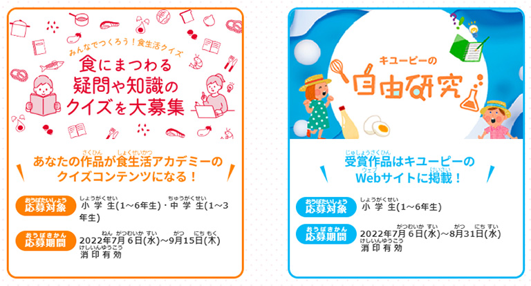 | 応募方法 | 公式サイトからダウンロードした応募用紙に、住所、電話番号、氏名(お子さま)、学年を明記の上、指定の住所までお送りください。公式サイト https://www.kewpie.com/academy/research/ | 公式サイトからダウンロードした応募用紙に、住所、電話番号、氏名(お子さま)、学年を明記の上、指定の住所までお送りください。公式サイト https://www.kewpie.com/academy/food-quiz/ |