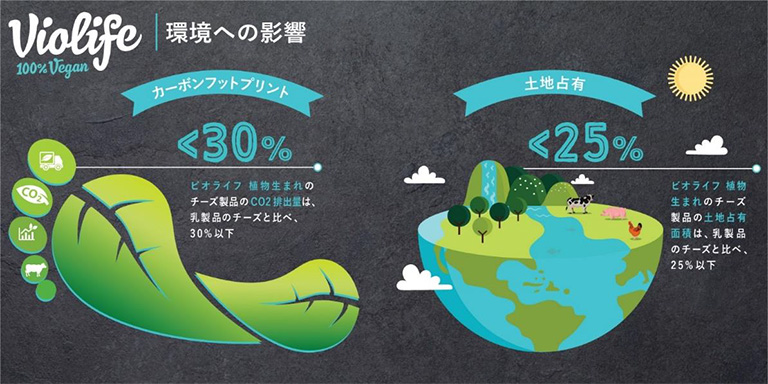 当社が日本国内で販売している「Violife」植物生まれのチーズ 既存 4商 品 について、生産から廃棄までのライフサイクルにおけるCO₂排出量が、日本国内で販売されている乳製品のチーズの30%以下に、土地占有面積も25%以下に抑えられていることが判明しました(※2)。主な理由は、この 商品 がココナッツオイルなどの植物を主原料としており、乳牛を生育する工程が不要であることに由来しています。