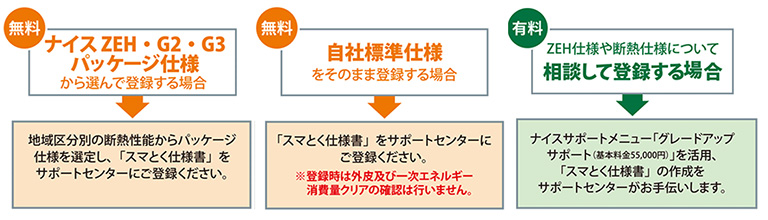 「スマとく」のご利用に当たっては、事前に断熱材及び住宅設備機器の仕様をナイスサポートシステムにご登録いただきます。具体的には、①「ナイスZEH」「G2」「G3」の各パッケージ仕様の中から選択して登録する方法、②自社標準仕様をそのまま登録する方法、③ZEH仕様や断熱仕様について個別に相談して登録する方法のいずれかをお選びいただきます。あらかじめご登録をいただくことで、その後は、実物件の図面をご提供いただければ、必要に応じて、省エネ計算や各種申請代行、光熱費シミュレーションといったサポートメニューを、スピーディーにご利用いただくことができます。