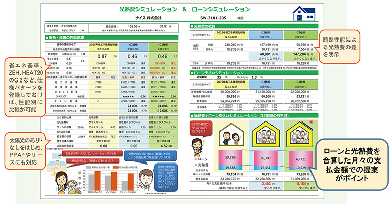 「光熱費・ローンシミュレーション」では、住宅購入後のトータルコストを、省エネ基準、ZEH、HEAT20のG2・G3、太陽光発電の有無など、仕様別に比較できる資料を作成いたします。そうすることで、お施主様が比較しやすく、高性能化することのコスト面でのメリットを感じていただけます。住宅の高性能化には相応にコストがかかるものの、断熱性能等が向上することで、光熱費を抑制することができます。