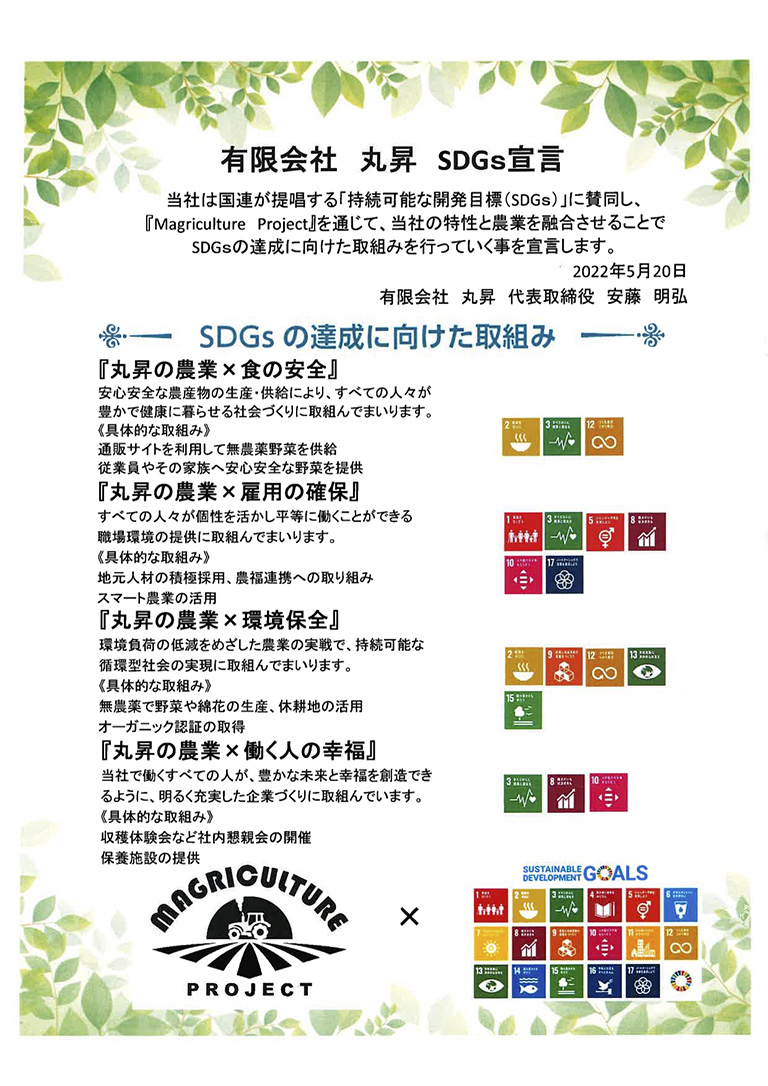 有限会社丸昇(愛知県海部郡蟹江町富吉)は国連が提唱する『持続可能な開発目標(SDGs)』に賛同し、『Magriculture Project』を通じて、当社の特性と農業を融合させることでSDGsの達成に向けた取組みを行っていく事を宣言します。