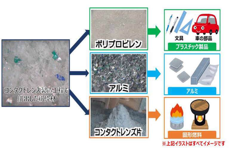 混合物から分離されたポリプロビレンは文具や自動車部品などの各種プラスチック製品へ、アルミは再びアルミとしてモノからモノへ、リサイクルされます。そして分別後に残ったコンタクトレンズ片は産業廃棄物として固形燃料などに生まれ変わります。