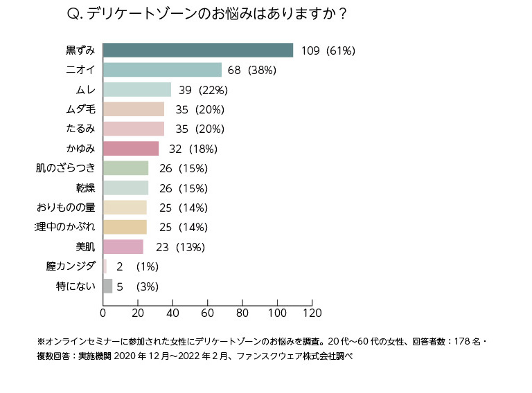 20代~60代の178名の方にご協力いただいたアンケートの結果、最も多いお悩み第1位はデリケートゾーンの黒ずみでした。