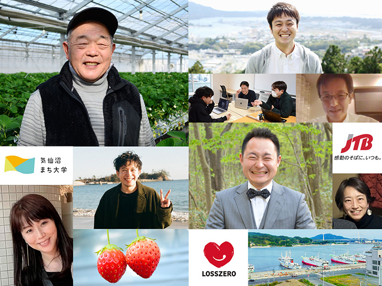 同商品はいちご農家シーサイドファーム波路上の佐藤代表(写真左上)、ロスゼロといちご農家の橋渡し役になった気仙沼まち大学運営協議会の成宮さん(中央右)、みなといちごのラベルデザインを担当した気仙沼出身・在住デザイナーの志田さん(中央左)他、多くの人の想いが重なって誕生しました。