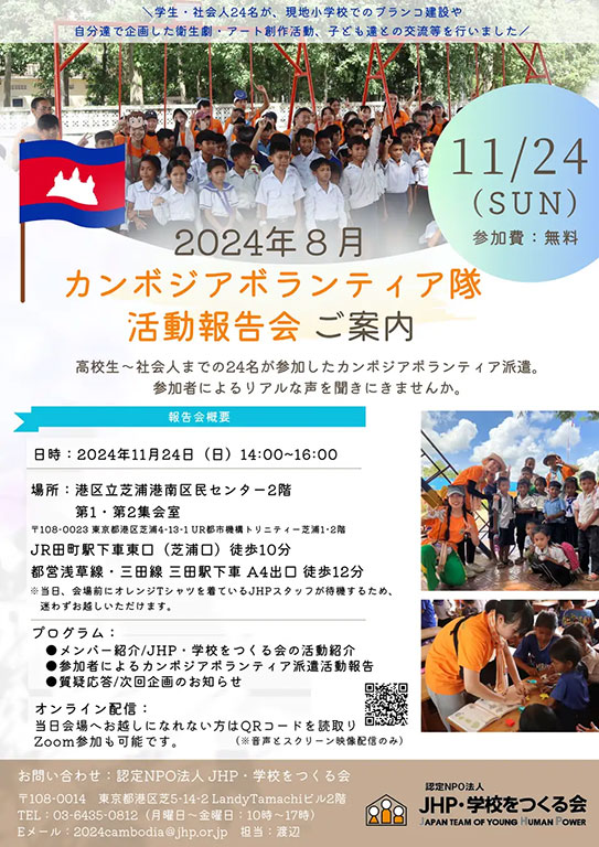 JHP・学校をつくる会は、『カンボジア体験ボランティア』参加者の生の声をお届けする活動報告会を開催します。